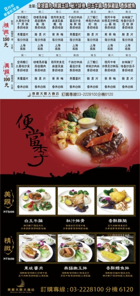 尊爵天际大饭店,精致美馔便当季,欢迎来电订购,订购专线:03-2228100,分机:6120