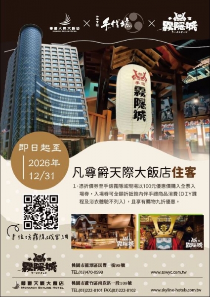 專題文章:尊爵天際大飯店住宿享手信坊、霧隱城購物、門票優惠 444次閱讀 憑折價券至手信霧隱城現場以100元優惠價購入全票入場券,入場券可全額折抵館內伴手禮商品消費(DIY課程及浴衣體驗不列入),且享有購物九折優惠。