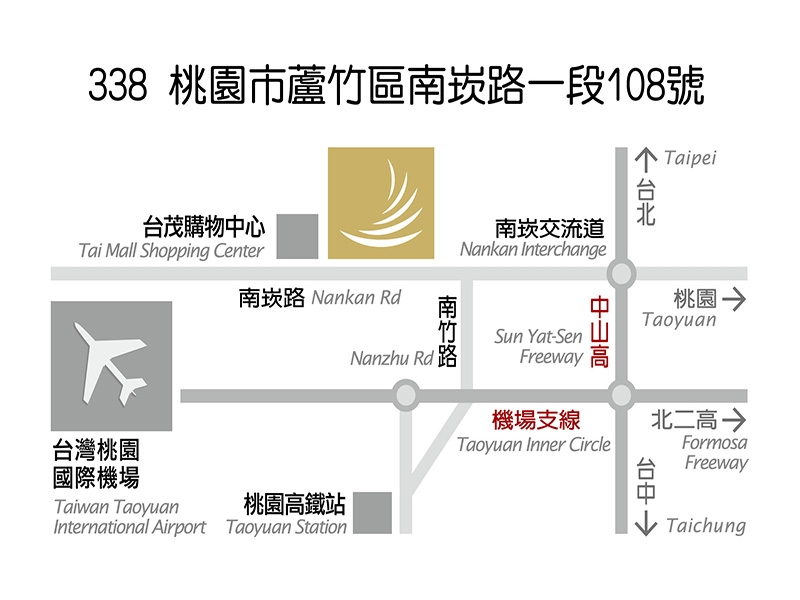 - 請行駛國道 1 號中山高速公路,於49公里處下「桃園(南崁)交流道」, 往蘆竹及桃園國際機場方向行駛約 5分鐘即可到達。