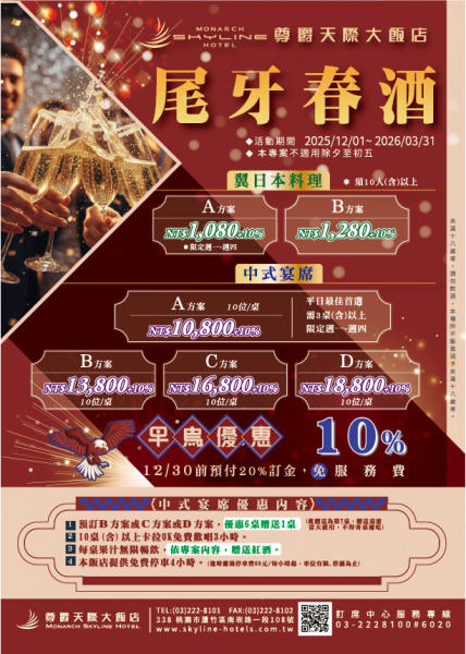 最新訊息:尊爵天際大飯店尾牙春酒專案 | 迎新春!